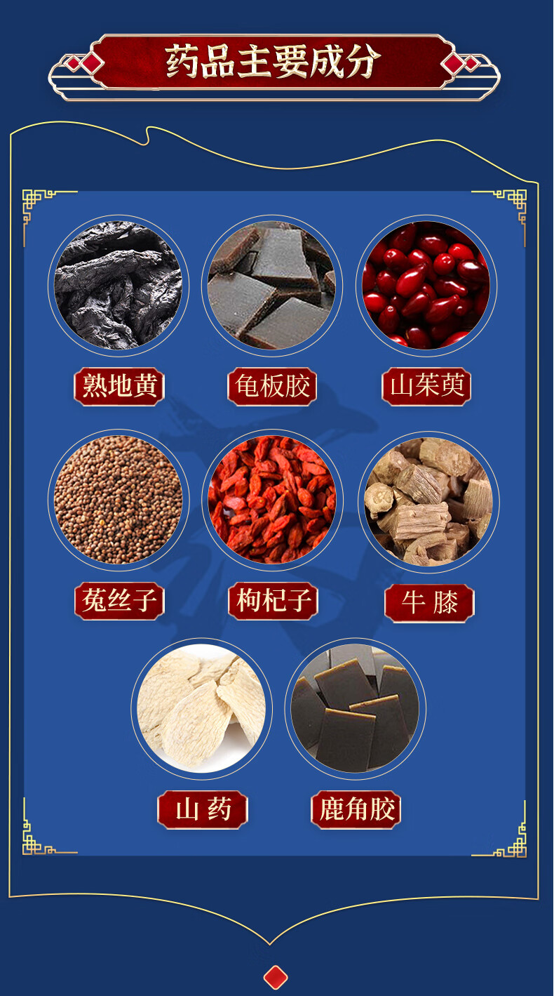 [成份]熟地黃、菟絲子、牛膝、龜板膠、鹿角膠山藥、山茱萸、枸杞子。輔料為蜂蜜。